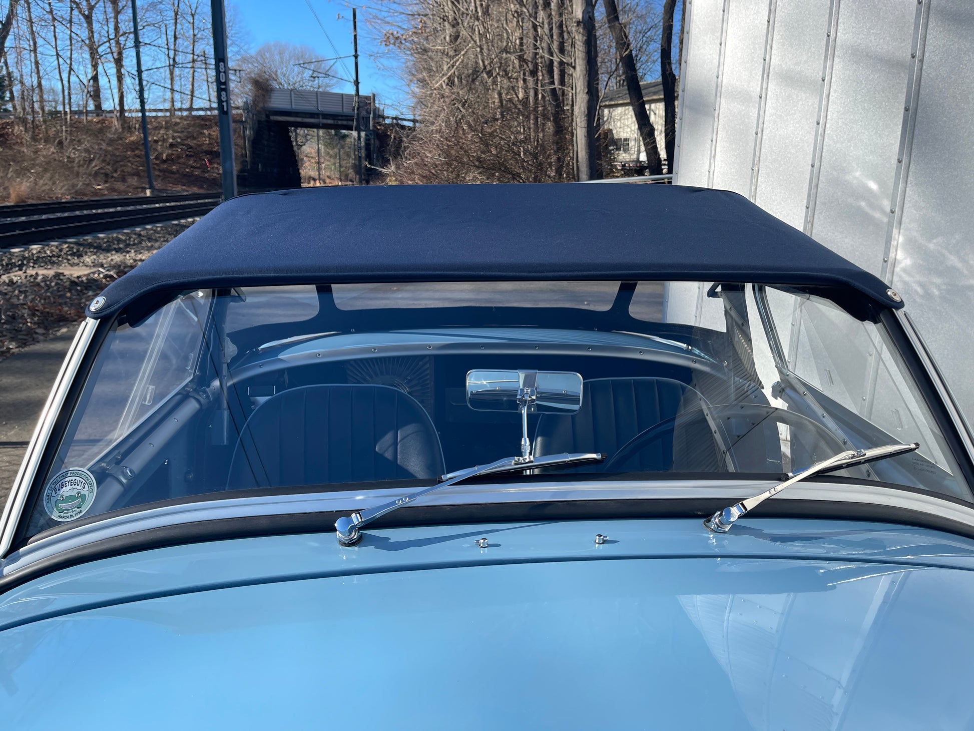 When driving your Bugeye with the top up, sometimes it can be a struggle to see behind you because the fabric around the rear window can block the rear view mirror's view. We've fit our electric Bugeye "E3" with an adjustable dash mounted rear view mirror to make it so whether the top is on or not, you can always see what's behind you!