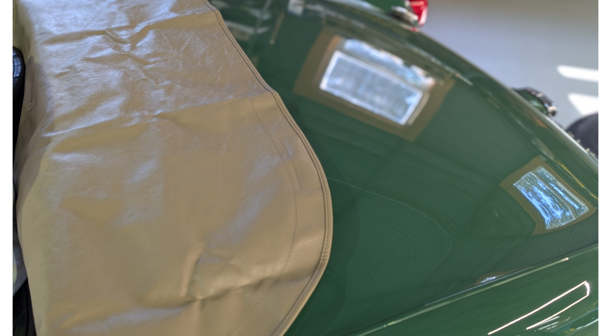 Tops are a wonderful color complement for these cool cars. White tops are great in hot weather, and tan looks great with all green variants. Or choose a black top, the most common choice, and you can’t go wrong. All our tops are easier to fit than most. These Pebble Grain vinyl materials tops are a good economical choice. Click here for our higher quality, "Deluxe Vinyl Tops," a slightly more stretchy material that is easier to fit when cold. All tops require custom fitting to your particular car (regardless of where you buy them) best done at our shop if your car is local, or at the shop of your local auto or marine interior professional.