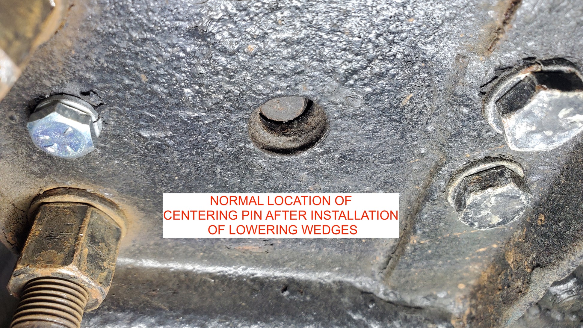 NOTE: After installing the lowering wedges the centering pin in the leaf spring will no longer fit itself in its appropriate hole. This is normal, and there are enough alternative lateral restraining devices to account for this.