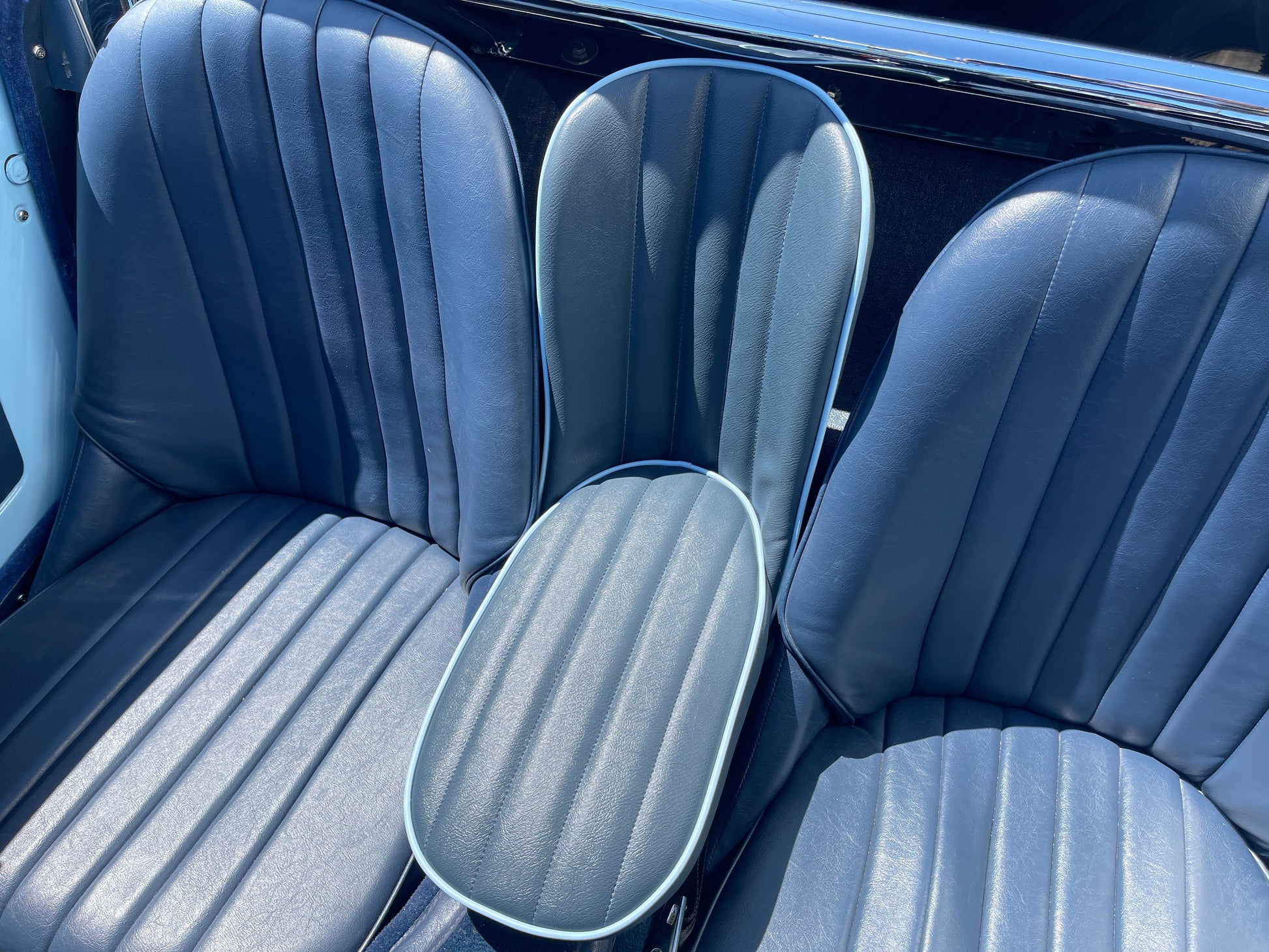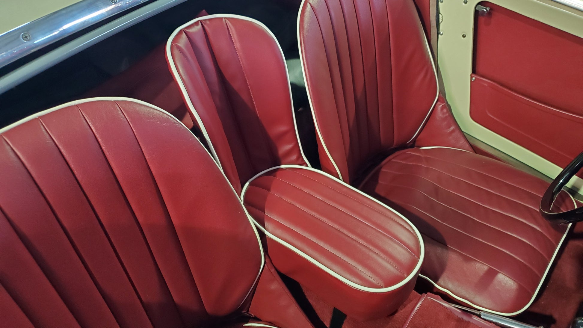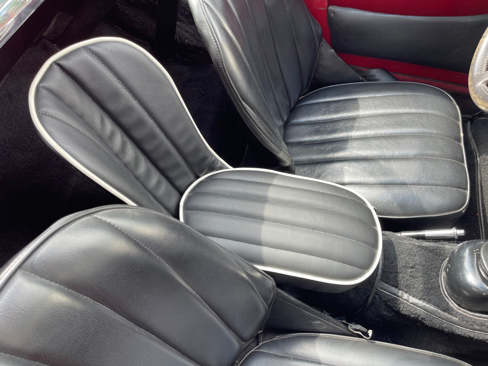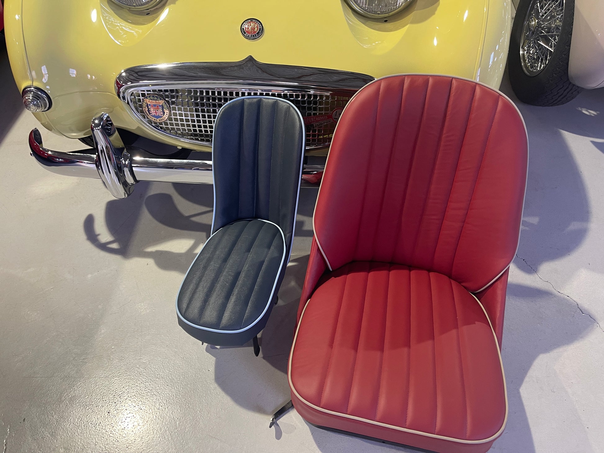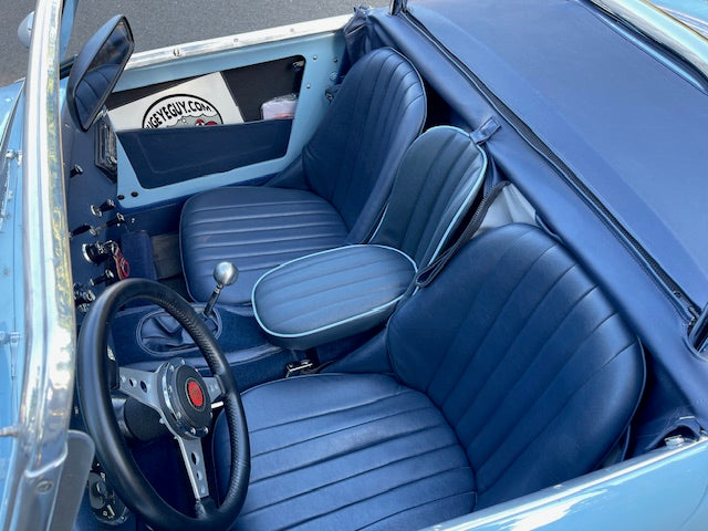 Each seat is laboriously built to order. We offer them in the stock color combinations of navy blue with light blue piping for Iris blue cars, black with white piping for Olde English white cars, and red with white piping for Nevada Beige and Olde English white cars with red interiors.