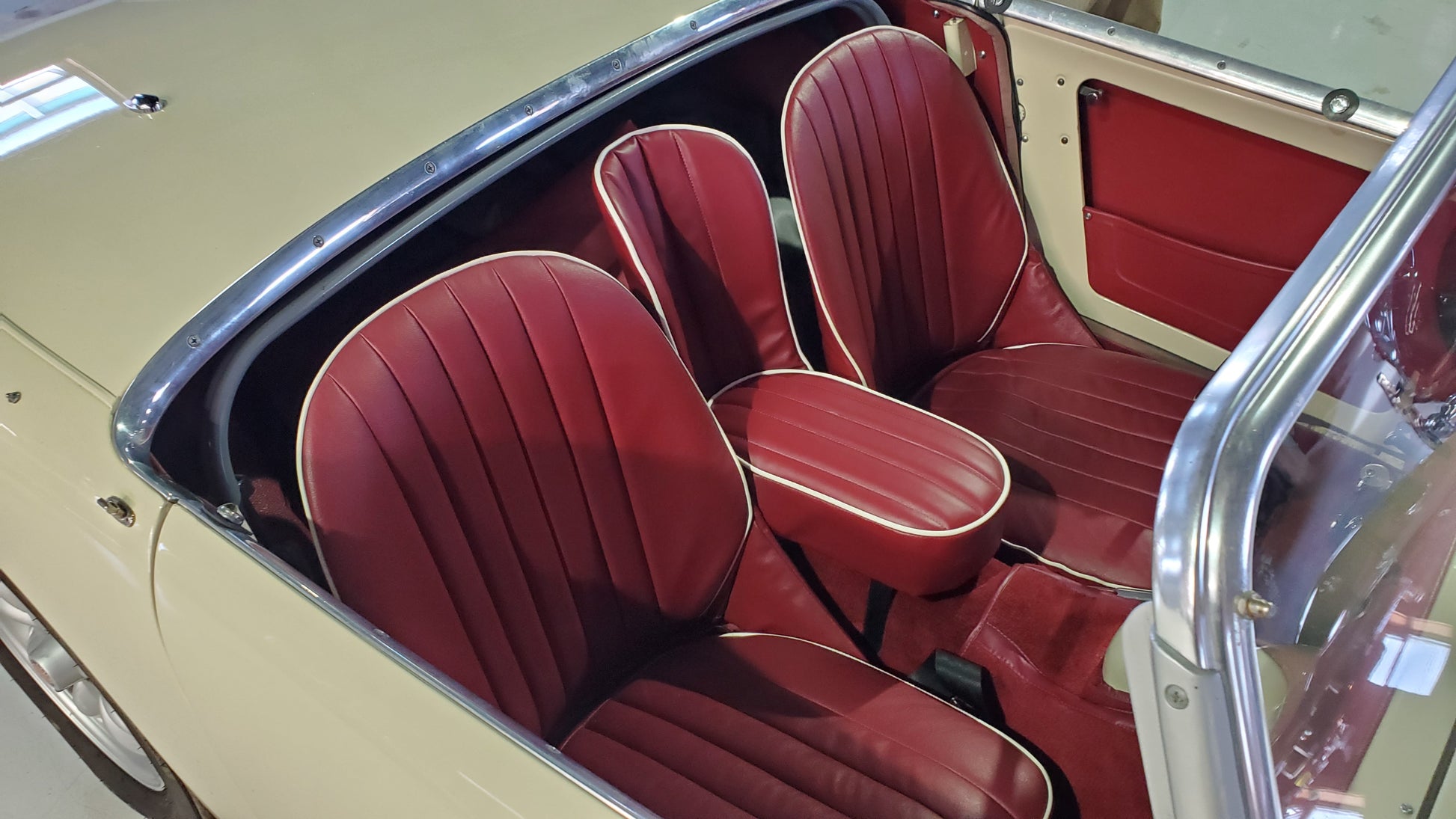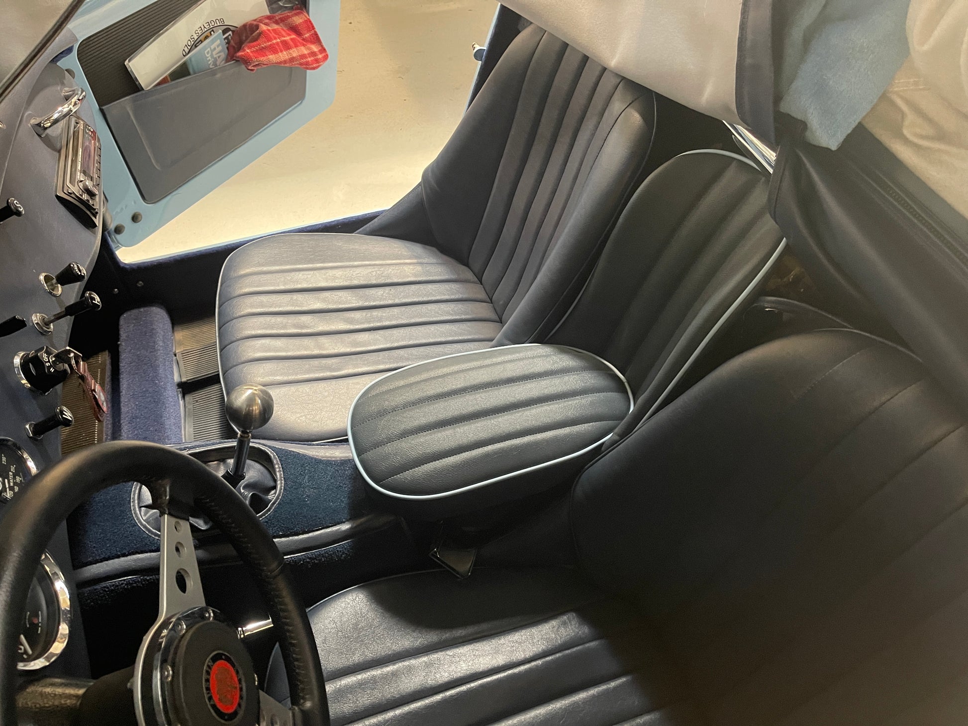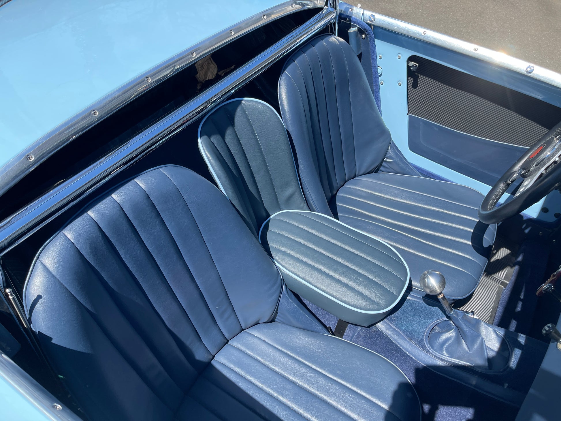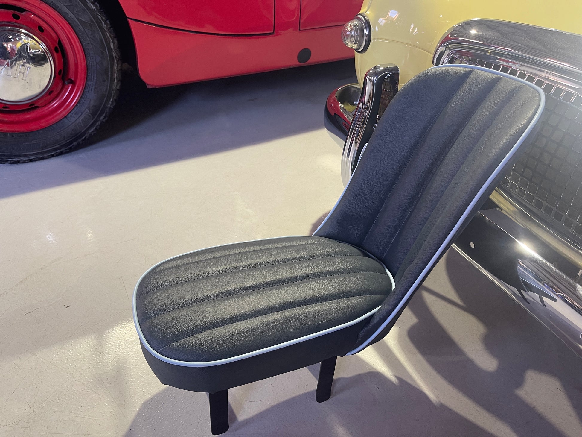 Each seat is laboriously built to order. We offer them in the stock color combinations of navy blue with light blue piping for Iris blue cars, black with white piping for Olde English white cars, and red with white piping for Nevada Beige and Olde English white cars with red interiors.