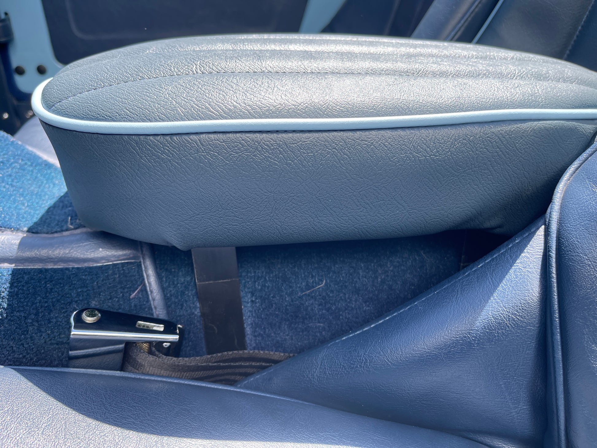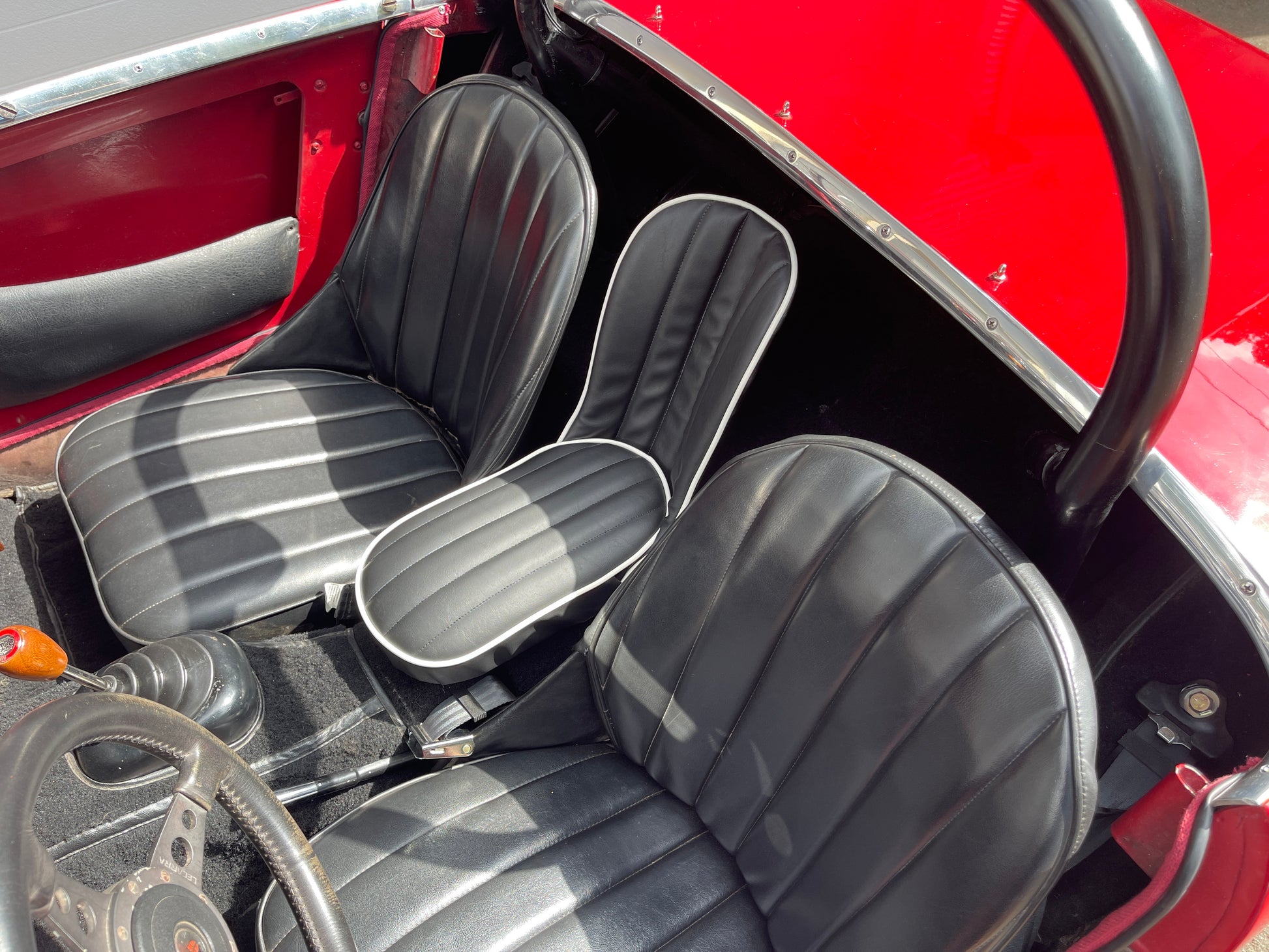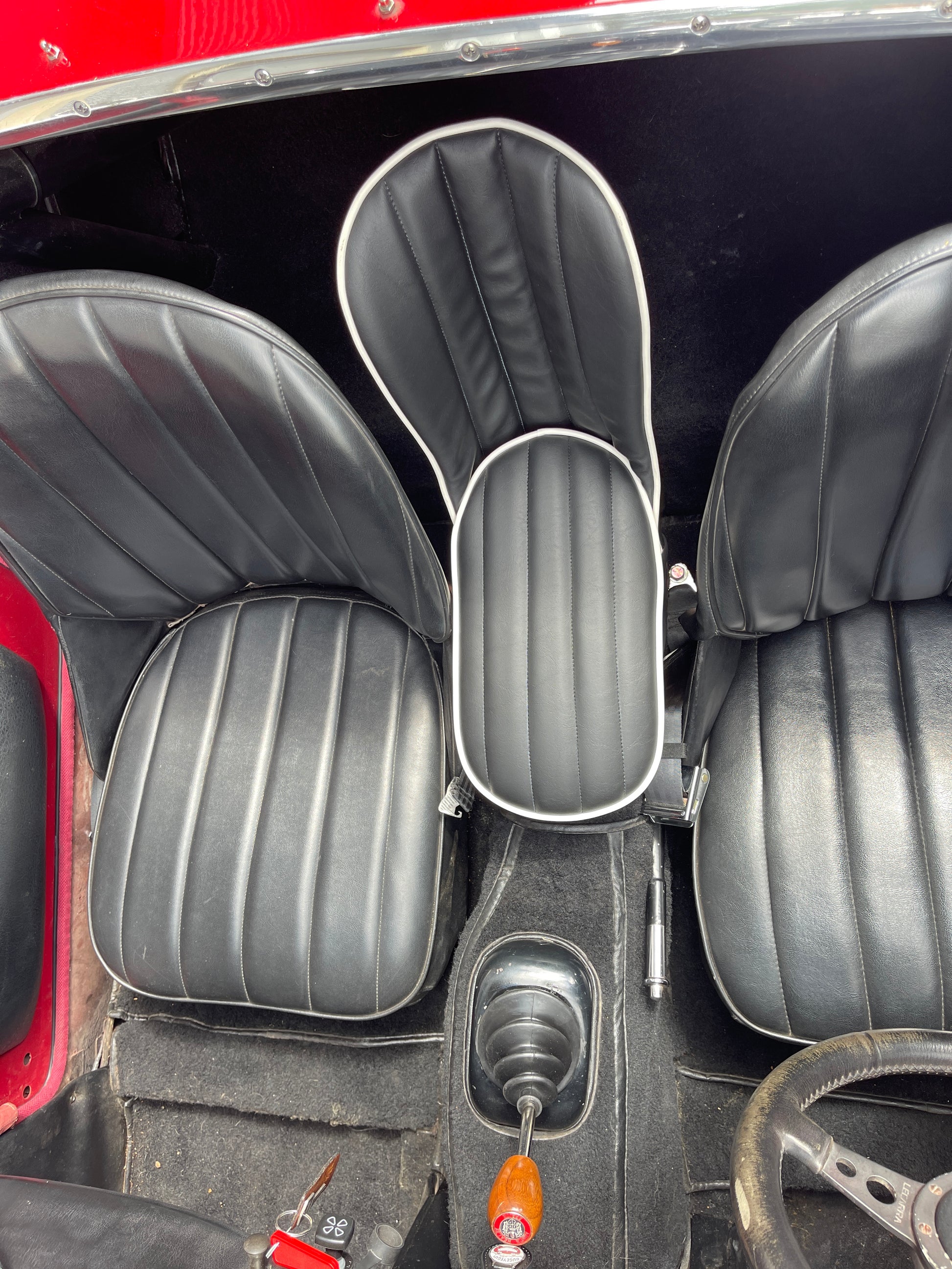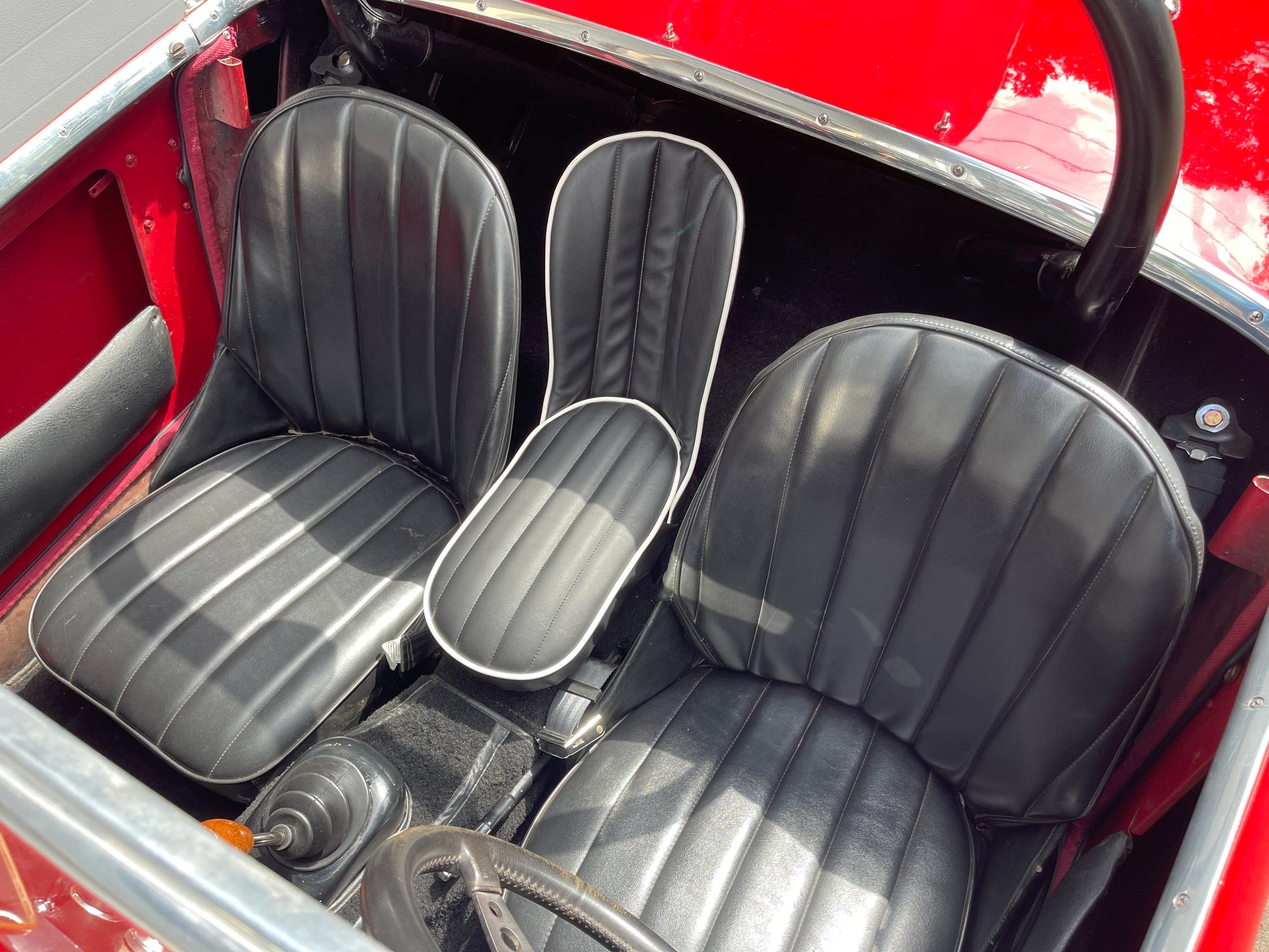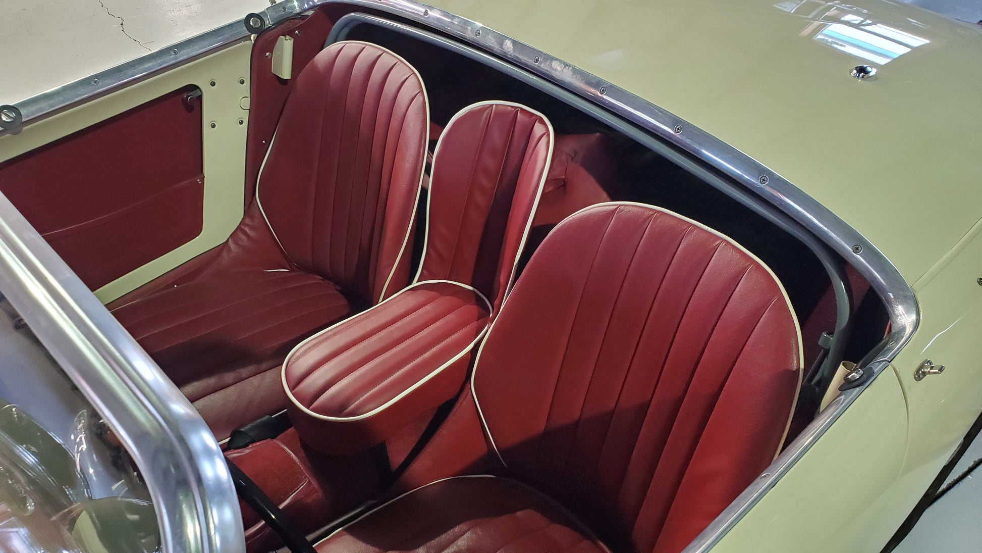Each seat is laboriously built to order. We offer them in the stock color combinations of navy blue with light blue piping for Iris blue cars, black with white piping for Olde English white cars, and red with white piping for Nevada Beige and Olde English white cars with red interiors.