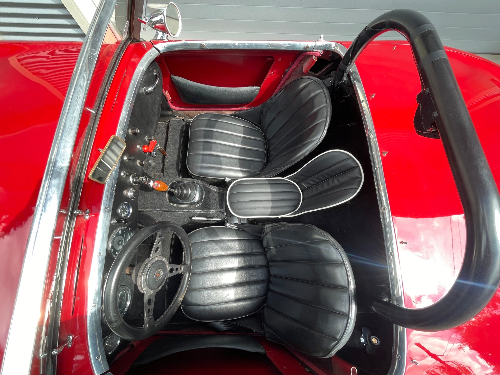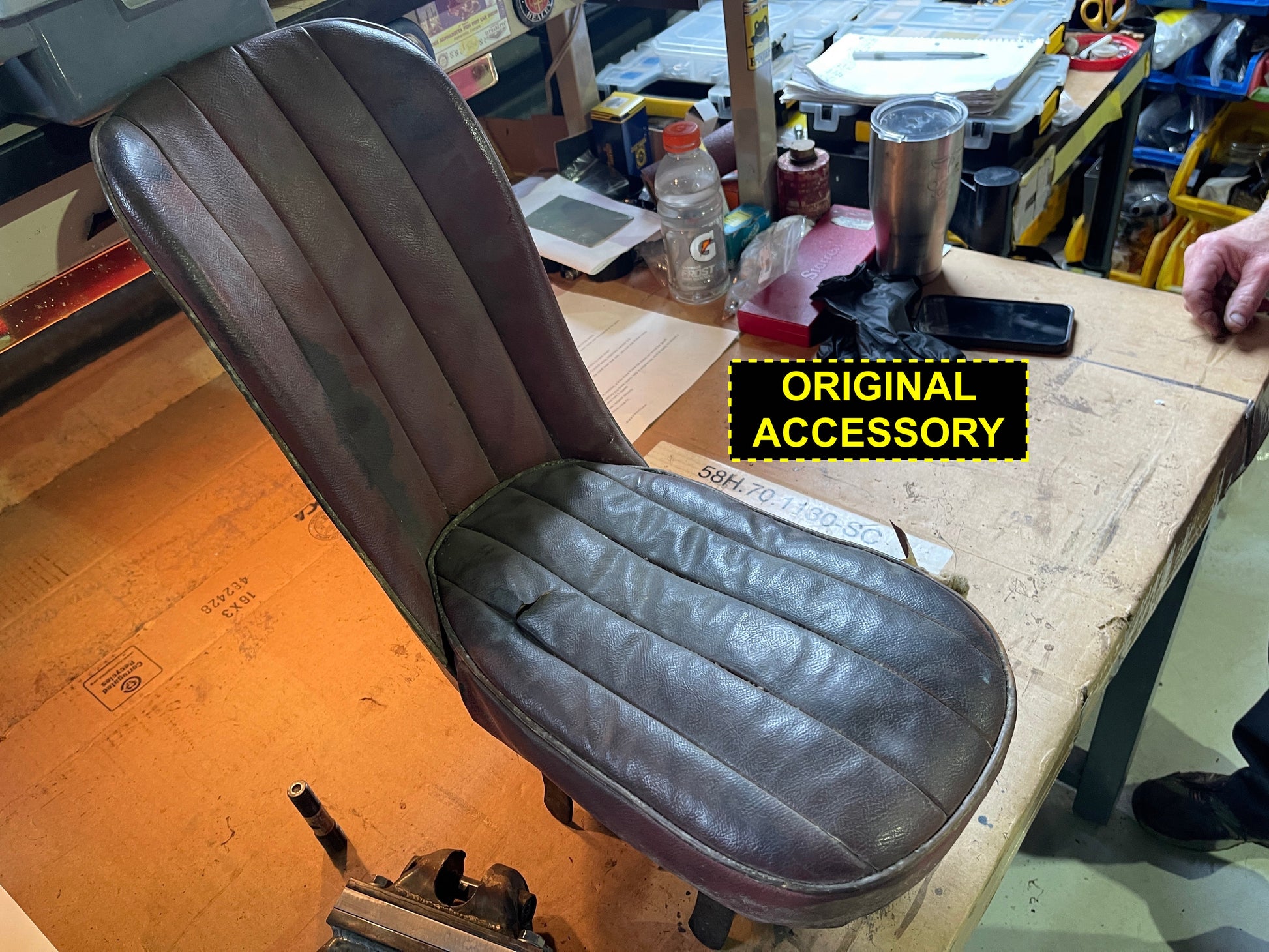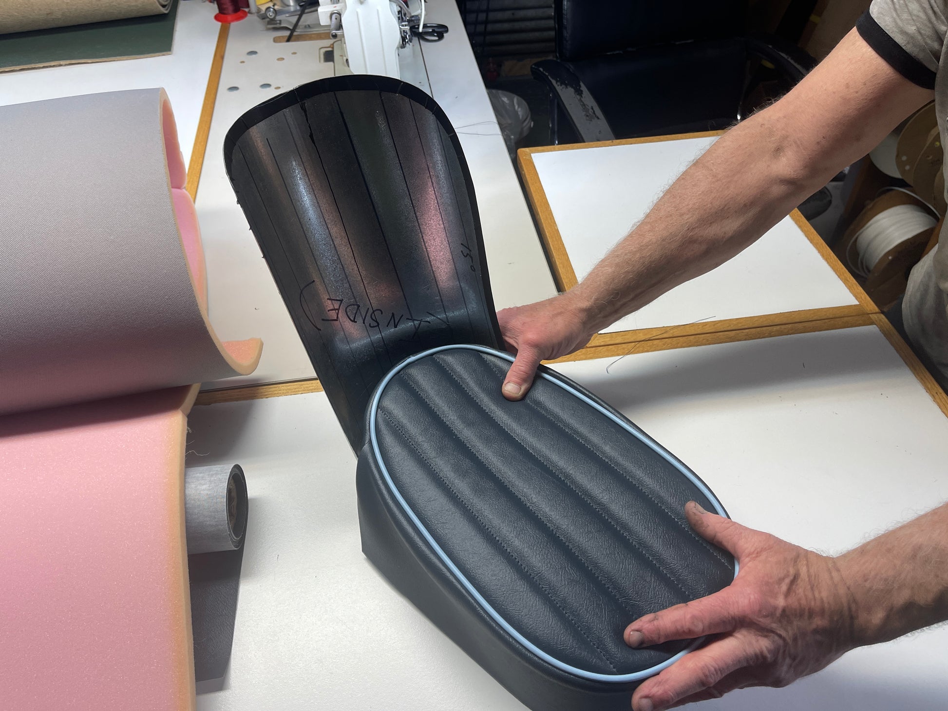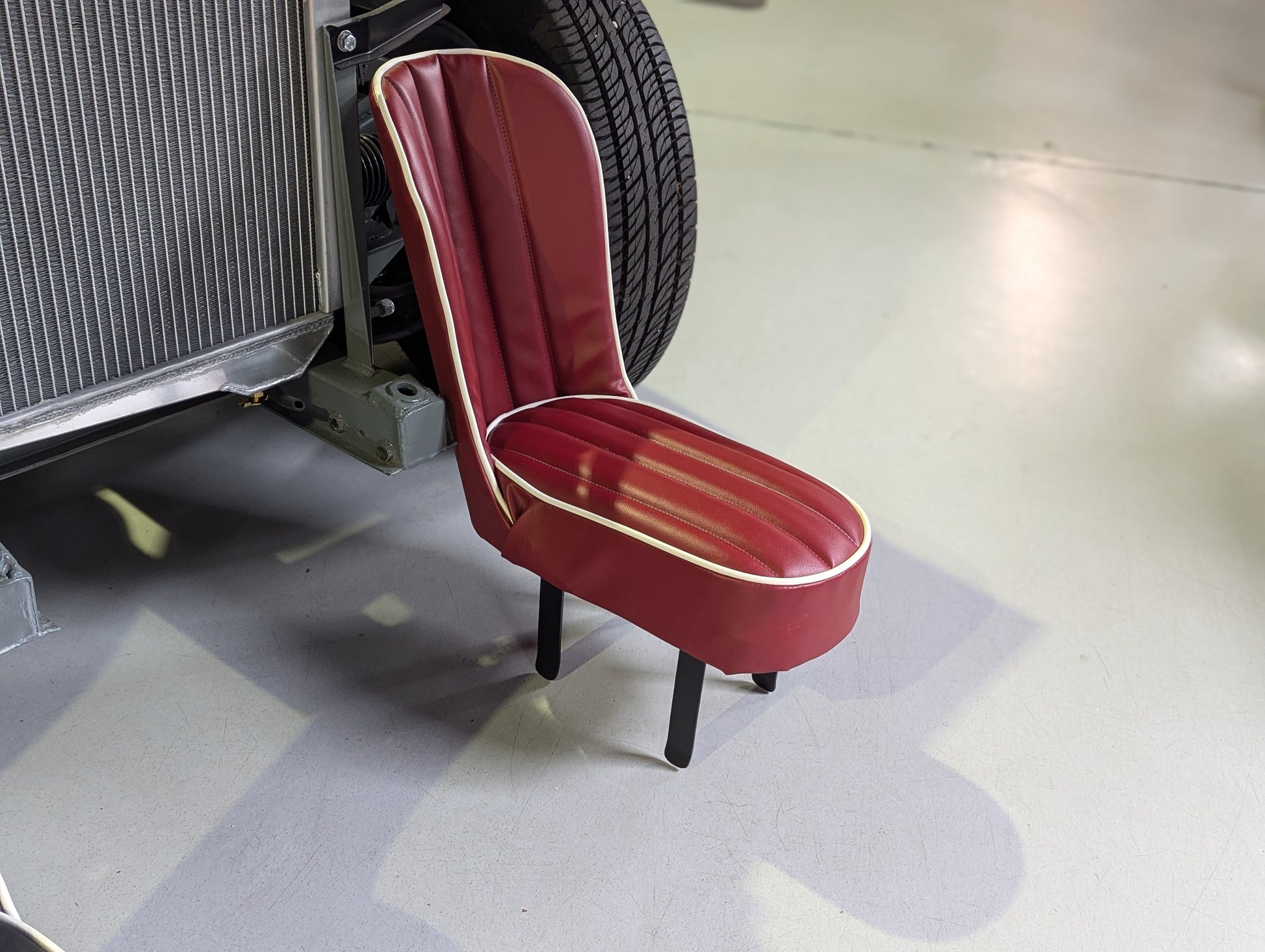Each seat is laboriously built to order. We offer them in the stock color combinations of navy blue with light blue piping for Iris blue cars, black with white piping for Olde English white cars, and red with white piping for Nevada Beige and Olde English white cars with red interiors.