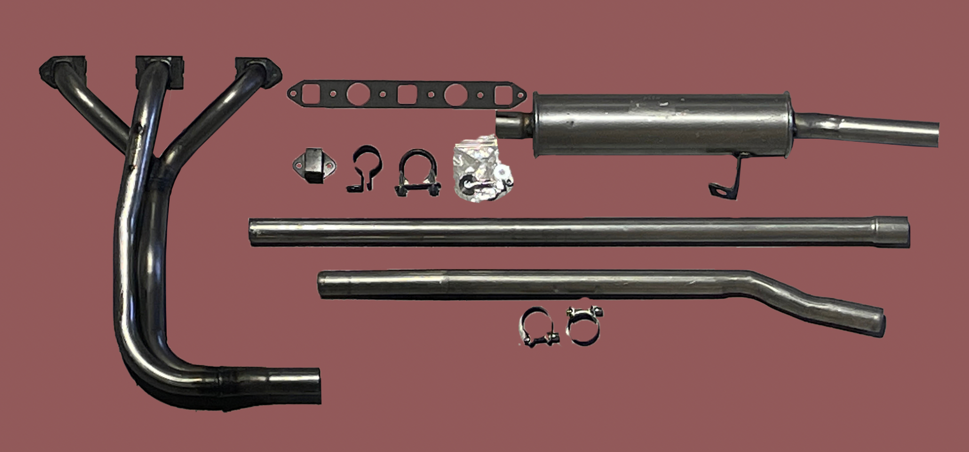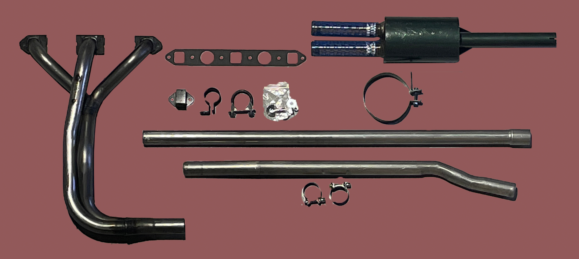 This kit comes with either our dual-tipped muffler for a sporty exhaust note or a stock style muffler if you prefer a quieter ride. The header and muffler are stainless steel. The center pipe is mild steel and all these pieces should last almost a lifetime. If you are looking for a great new exhaust system for any Sprite or Midget from 1958-1974, this system will make your car sound great and pull great!