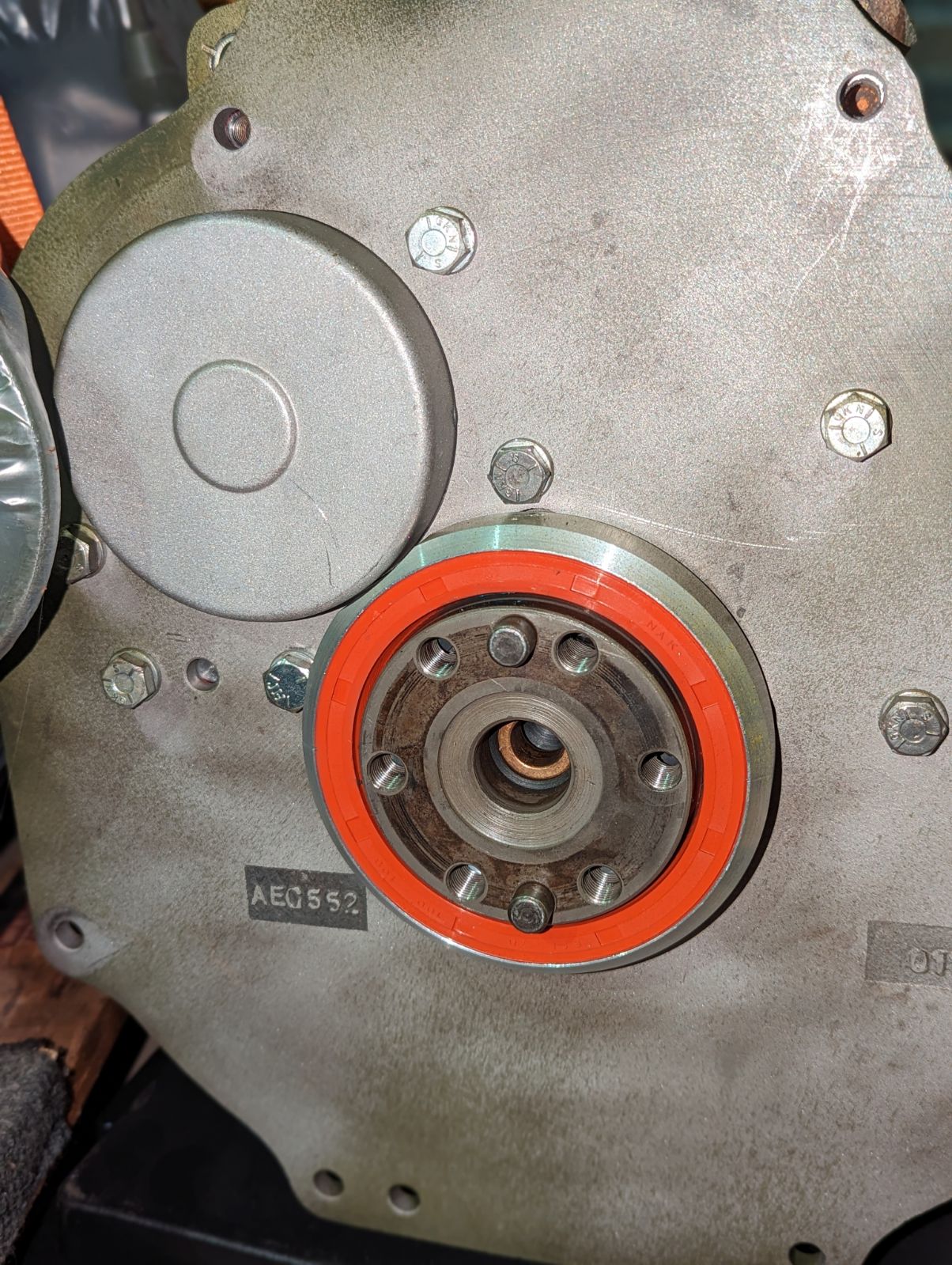 Note: The aluminum disk shown (that holds the seal) comes apart into two pieces for installation around the crankshaft.