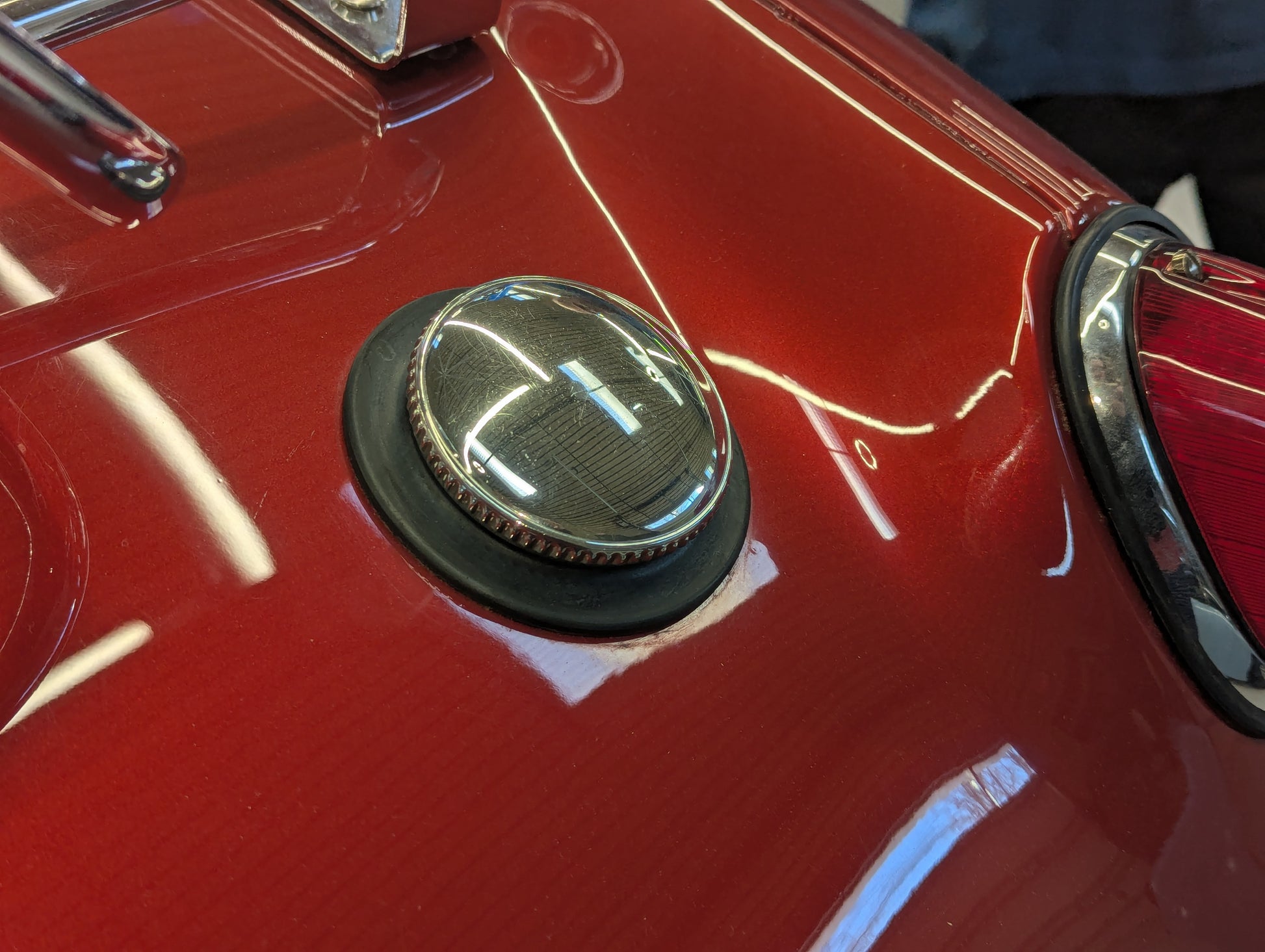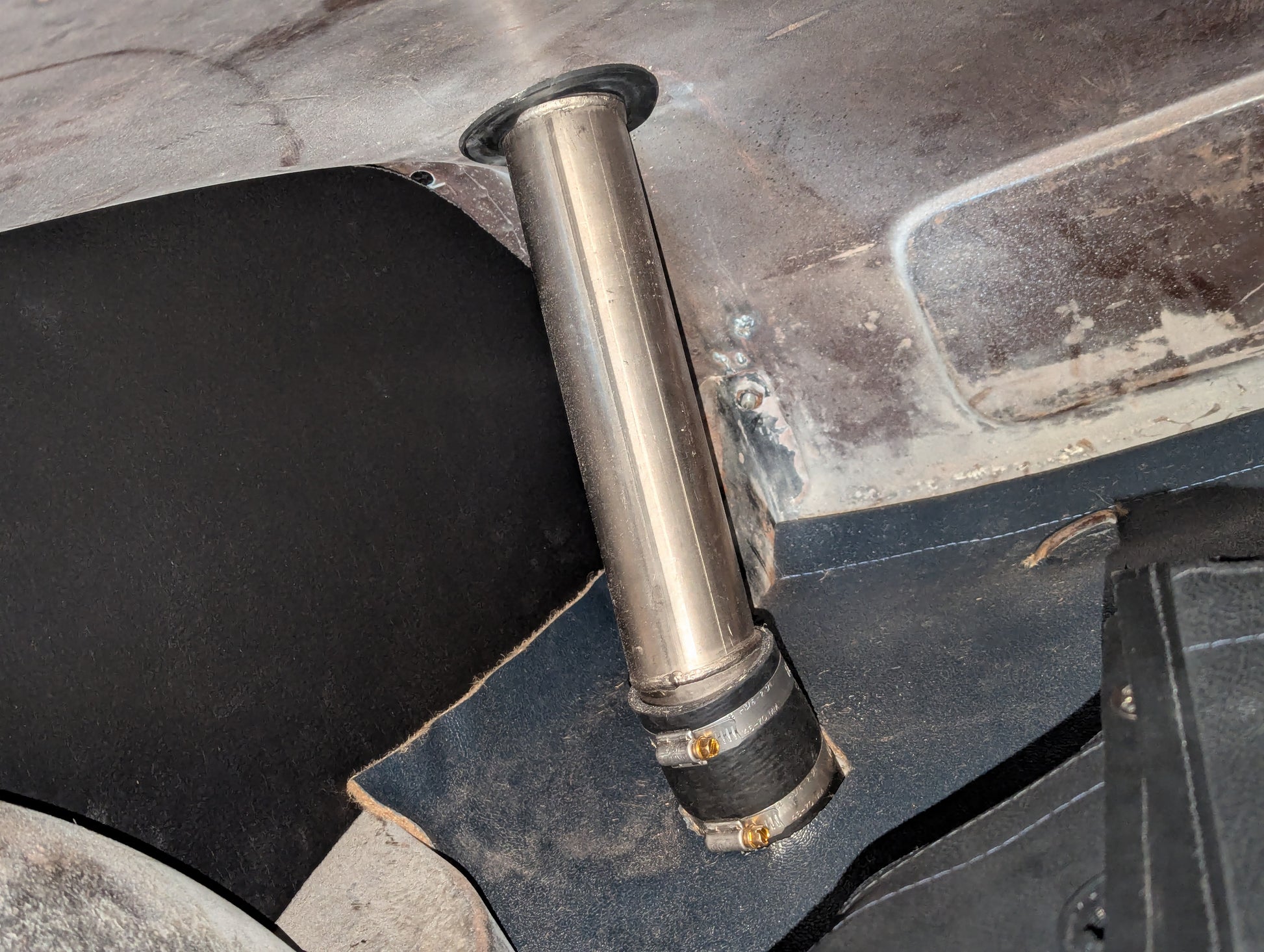 On aftermarket fuel tanks, the fuel filler neck is a separate unit from the tank itself and connected via this rubber filler neck hose and two hose clamps. We always use modern style hose clamps rather than the early style wire clamps because if you have a full tank and park in the sun, the fuel can expand up and leak out from the union of the hose to the tank and into the trunk of the car.