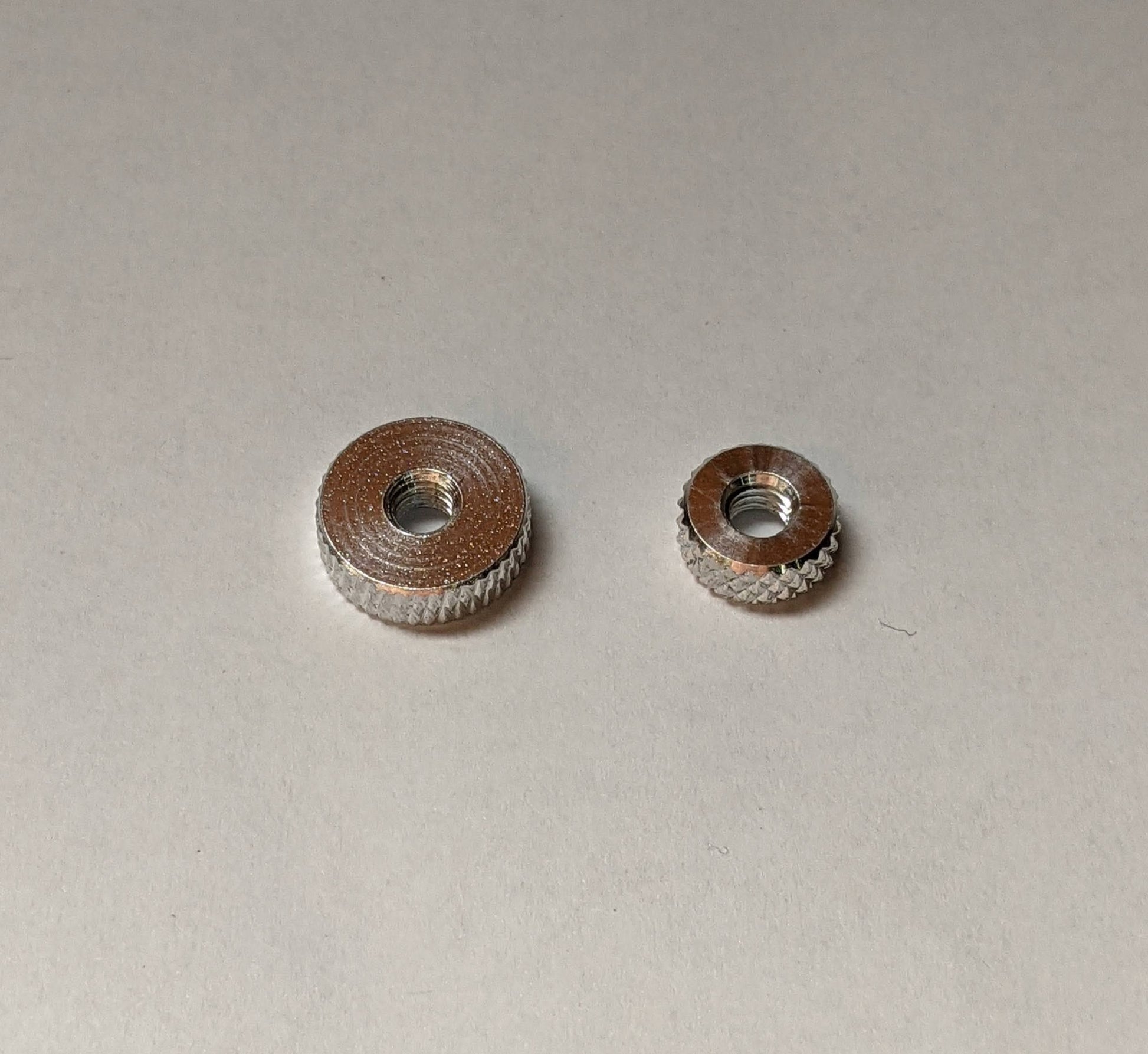 This is the knurled nut that is for the back of original gauges. Both thread sizes are the same, but we have two different OD nuts. The small nut has a 3/8" OD, while the larger one has a 1/2" OD.