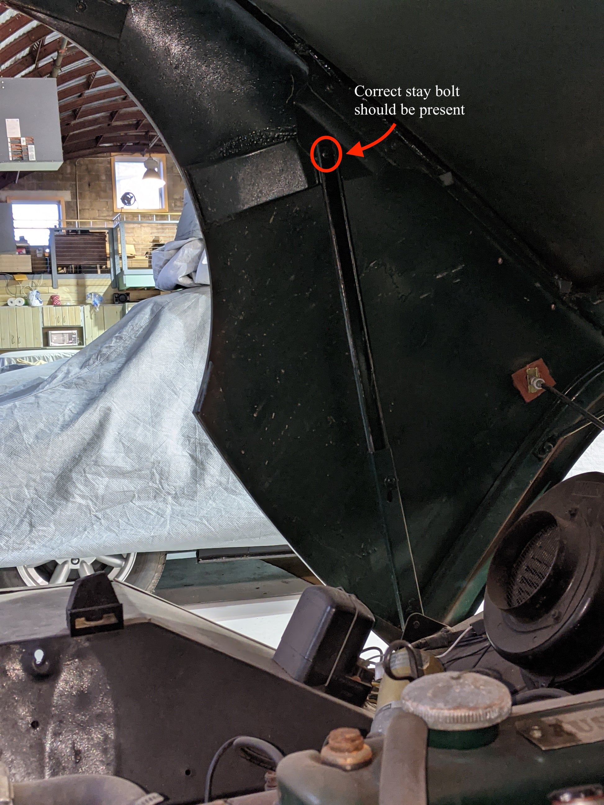 Restorer's Note: Most bonnets have damaged threads in the captive nuts into which these bolts thread. Make sure to restore them before you install these bolts. Chase the threads with a tap and lubricate the threads with grease before you mount the nose struts onto the bolts. Check and double check the threads, because if you break one of these, you will have a tough time getting out the broken piece. More importantly, these can be easily sheared at the step down to the threads so don't over tighten!