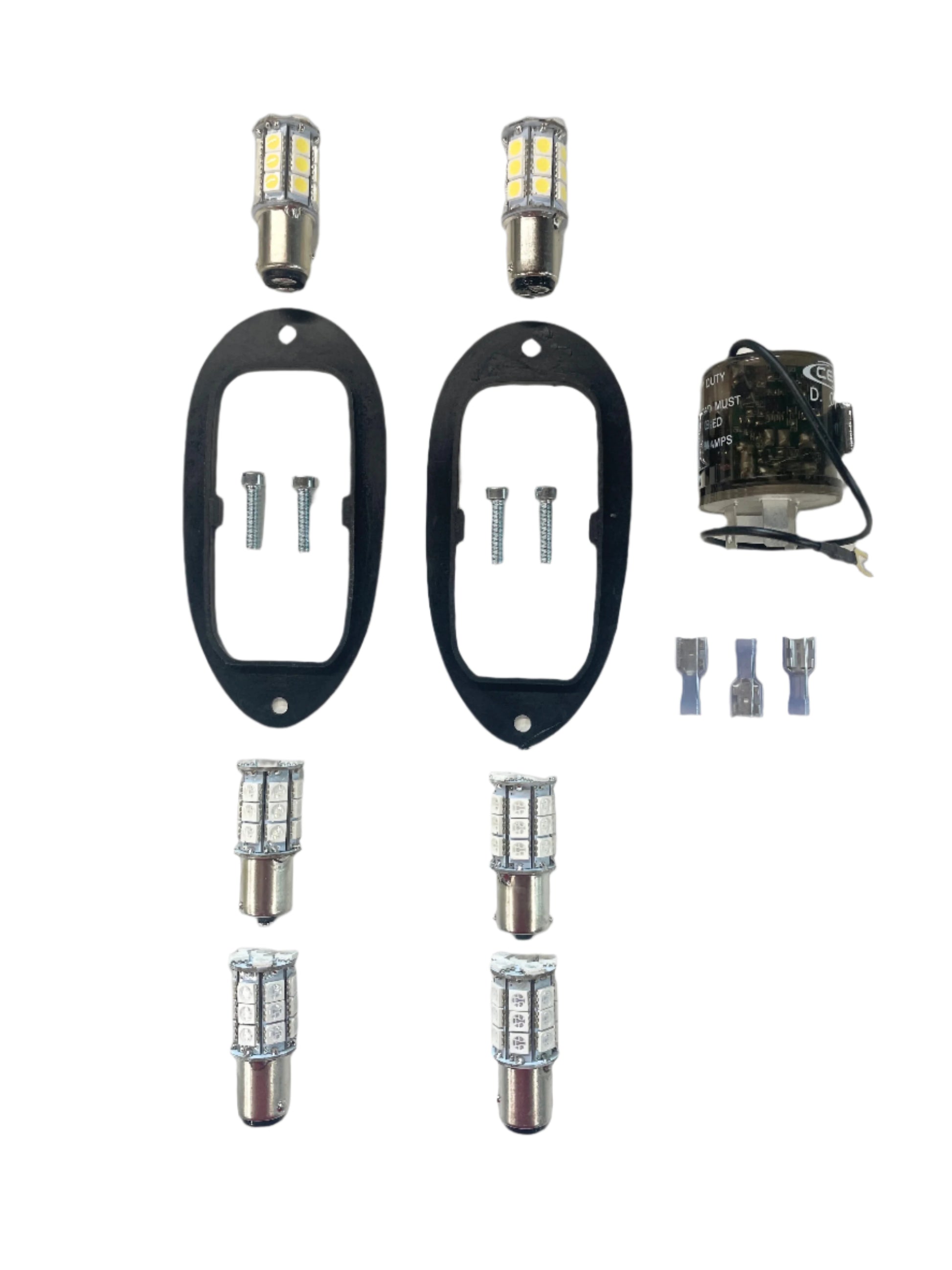 Each kit includes two white front park light/turn signal bulbs, two red rear turn signal bulbs and two red tail light/brake light bulbs. Also included are screws and new rubber gaskets for your tail light base to tail light lens. An LED flasher is also included, which is required to make your LED turn signals blink.