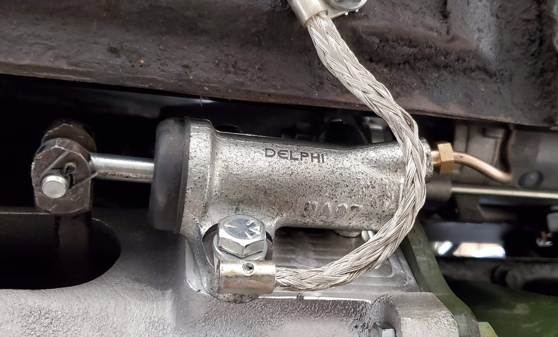 Note: The bleeder screw on the slave comes from the supplier as shown, with the bleeder screw in the forward-facing hole on the slave. This is done for shipping purposes, is incorrect for installation, as the bleeder needs to be in the top hole to allow the air to be bled from the clutch hydraulic system properly! We generally try to swap it to the correct hole before we ship it, but sometimes we don't catch it. See the photo of the slave properly installed with the bleed screw facing upward for easy bleeding.