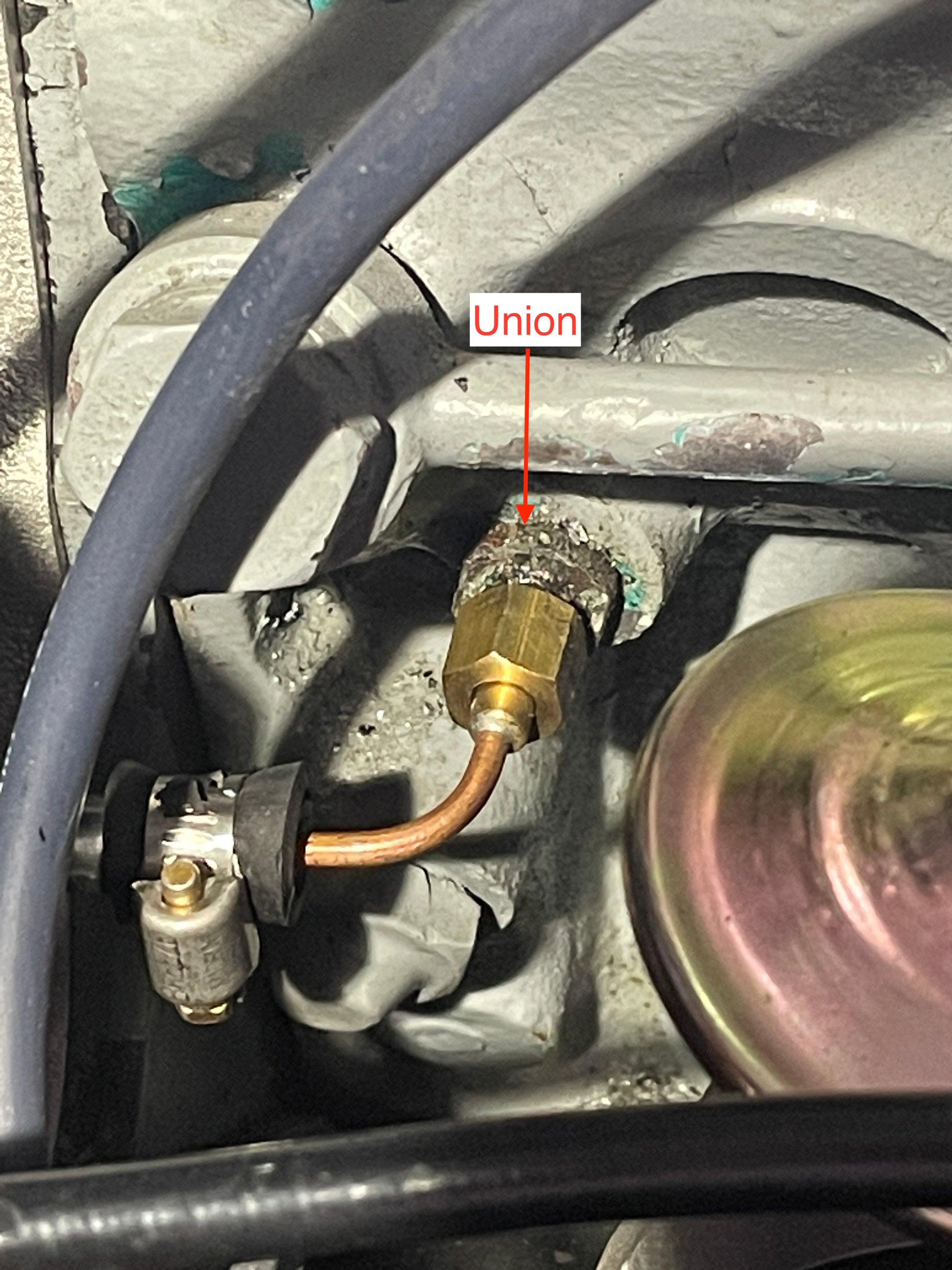 This is the union that is towards the back of the block (on the same side as the spark plugs, near the oil bridge line), which holds the right angle adapter for the oil pressure gauge.