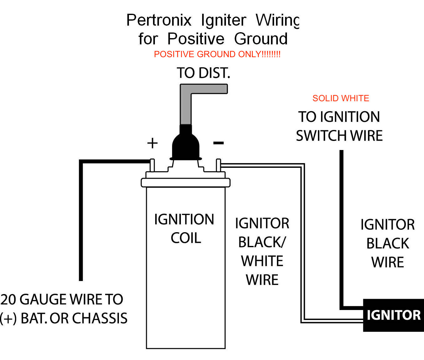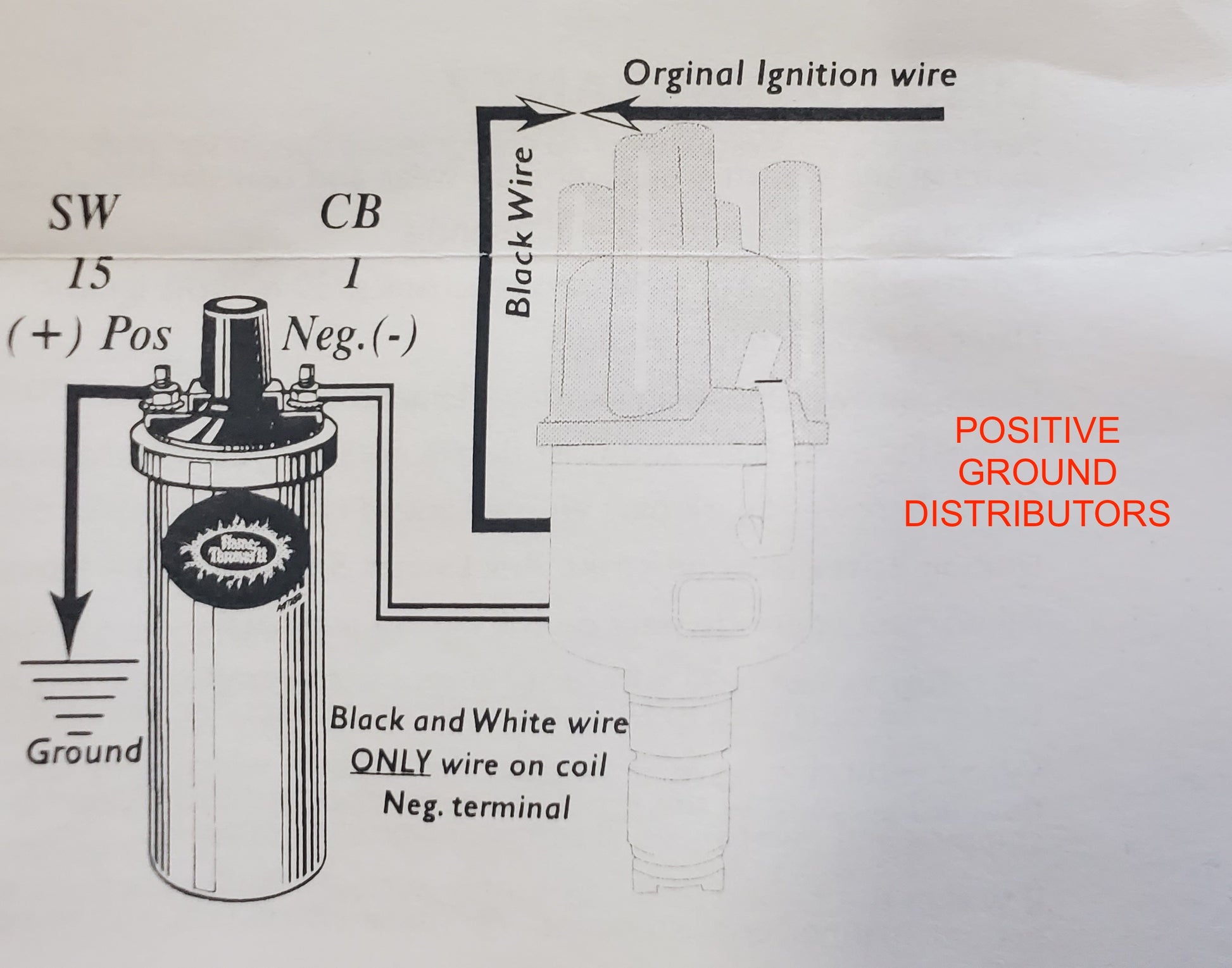 INSTALLATION TIP 2: Positive-ground Pertronix distributors connect differently from a negative-ground unit. Only ONE wire from the positive-ground pertronix unit connects to the coil, and the other is spliced into the original ignition wire. The positive side of the coil is grounded. See the photo gallery for an illustration of this.