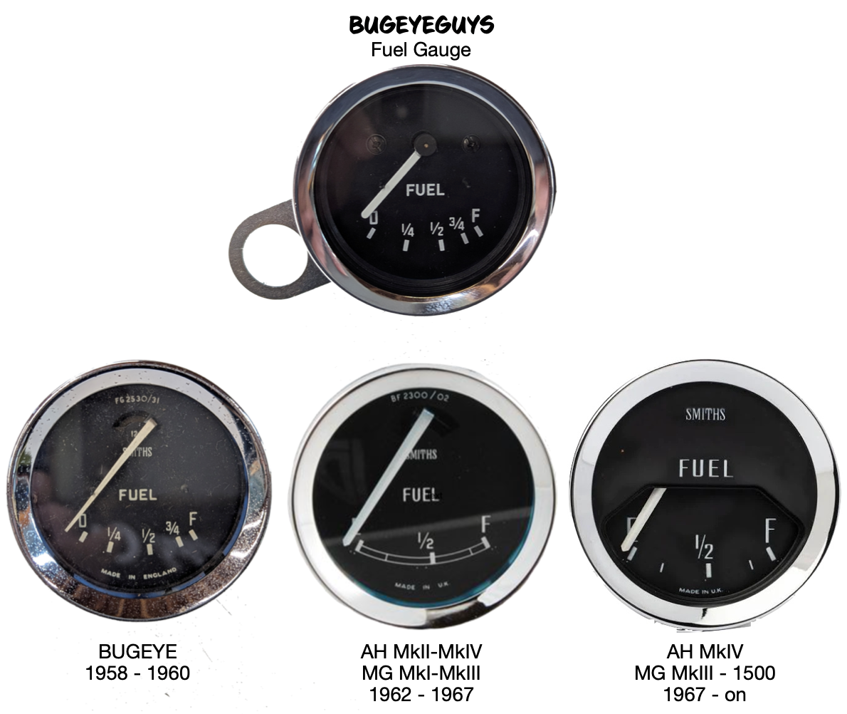 On Sprite MkII/Midget MkI, the fuel gauge went to a slightly different style with out the 1/4 & 3/4 markings, but the fuel sender is the same and this gauge will work for these cars as well. This gauge looks good in any Spridget up to 1967 (AH - MkIV # 72039 or MG - MkIII # 60459)