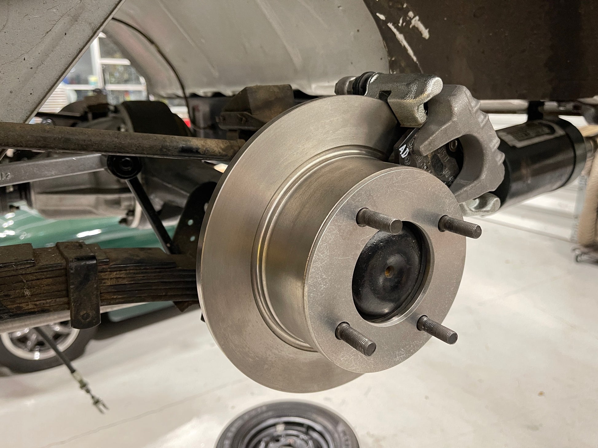 INSTALLATION NOTE FOR WIRE WHEEL CARS: When installing the rear disc brake kit, spacers often need to be added to the rotor to center it in the caliper (see installation instructions below). This may create a situation on cars equipped with wire wheels in which the studs used to hold the hubs and axles together are too short. If this occurs, you will need to take regular steel wheel studs (available here, you will need 8 of them) and cut them down until they are flush with the tightened nut. We recommend buying the studs with the conversion kit so you have them on hand to make this modification should the need arise.