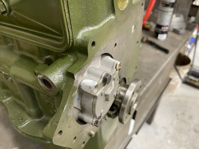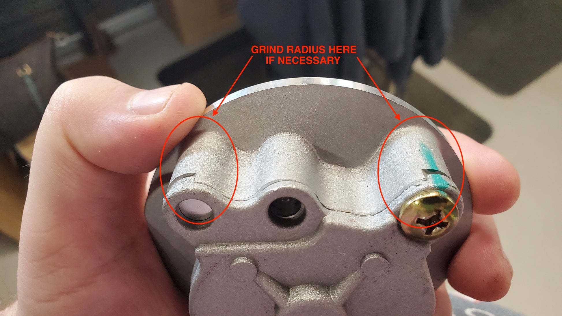 NOTE: Due to potential clearance issues between this oil pump and the oil pump cover plate, you may need to grind the radius of the upper flanges down to clearance the pump and allow the backing plate to seat fully onto its pins. See the photos for more details.