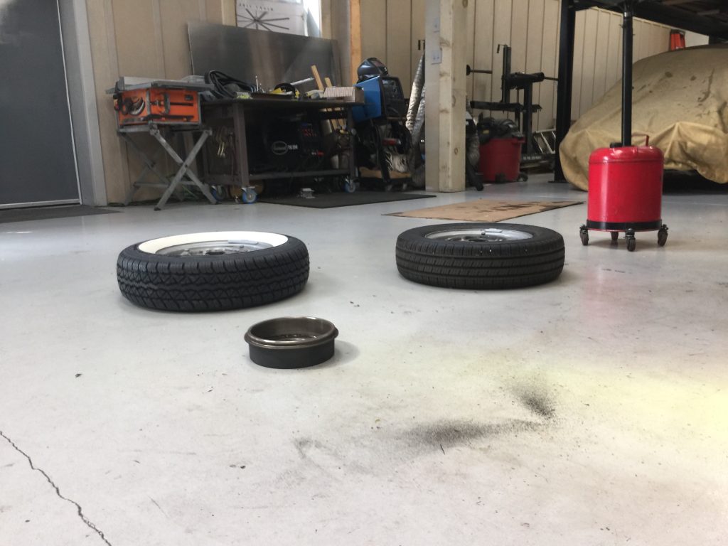 As shown in the pictures above, you can see and old 155 tire on the right and a new 165 plump white wall on the left. Just 10 more mm of width and look at how the 165 dwarfs the tire that was on the car (on the right).