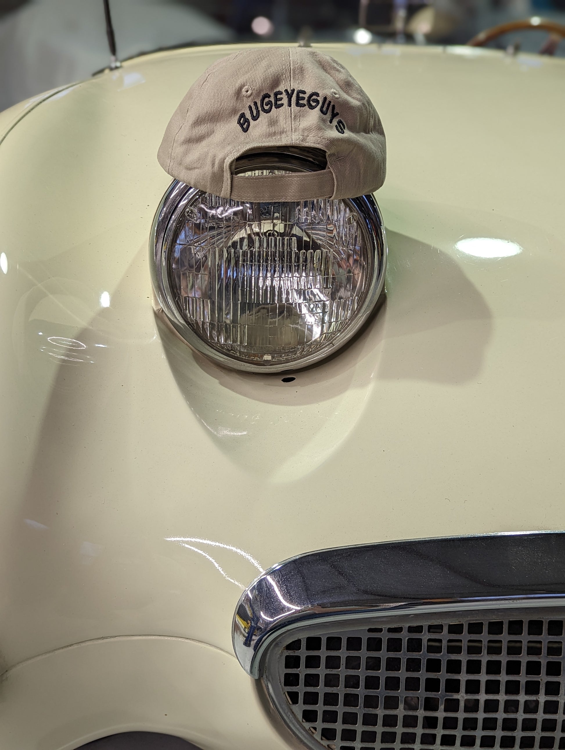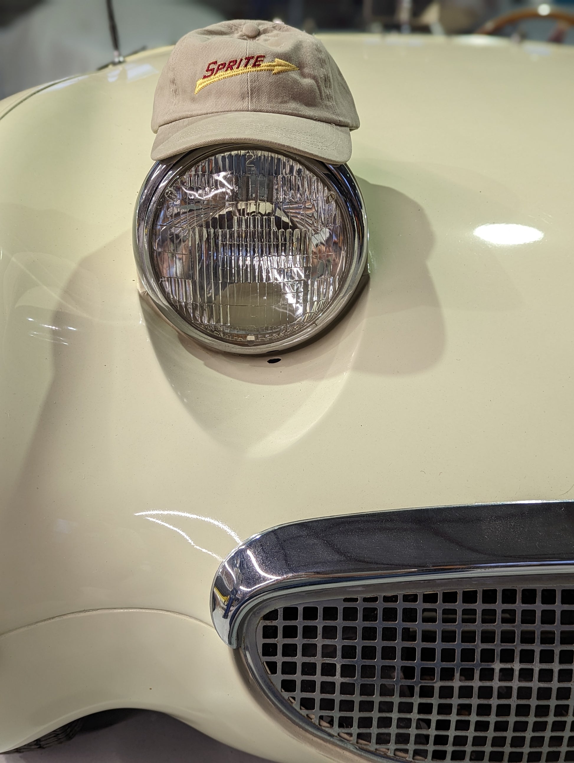 One of our favorite logos is the sprite arrow from a Bugeye’s boot, and here Ryan proudly displays our new embroidered hat featuring that graphic. This arrow was born in early 1958 and ditched in 1961 when the Mark II Sprite was announced, so only Bugeye lovers need apply.