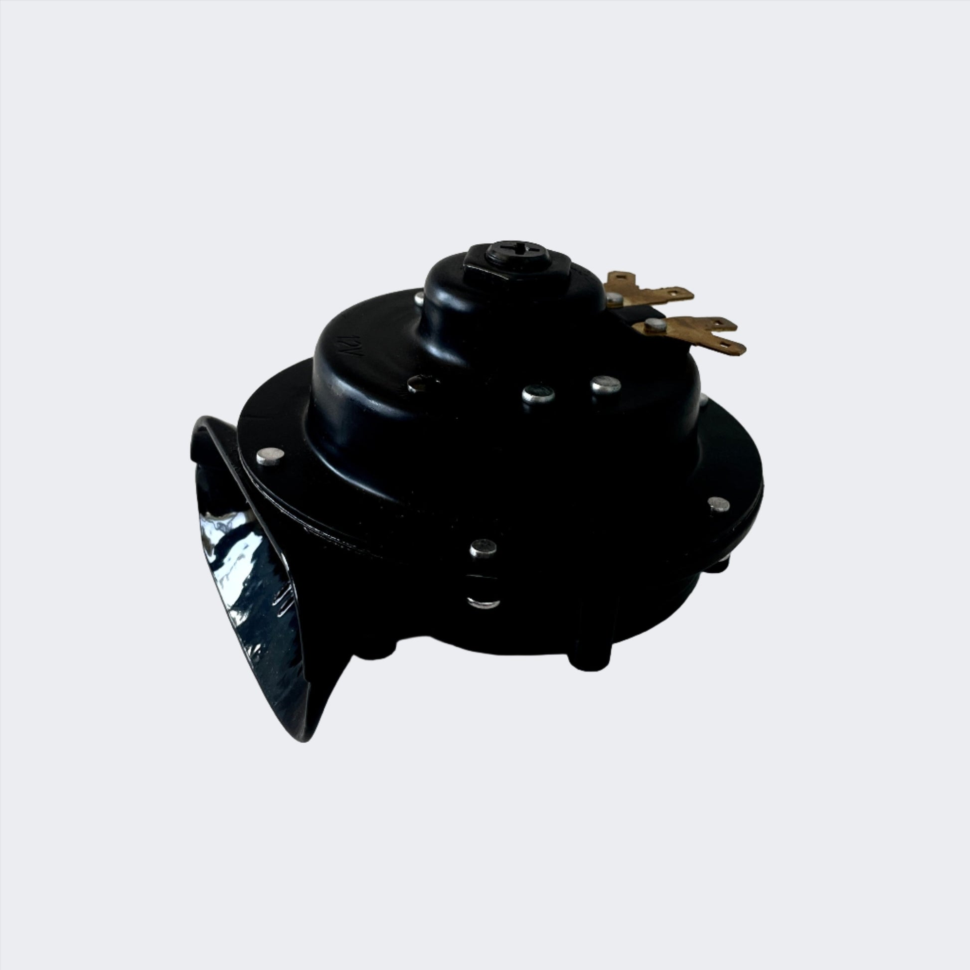I'm told these large horns were an option on Bugeyes. They are also common on MGTDs. Loud and large. Low and high notes are available. Run one or both. This item is the high note horn.