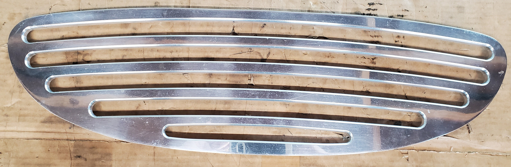 This grille is a custom piece made of aluminum with a polished face. It is much thicker and heavier than a standard chrome grille and the horizontal bars allow more air to pass through. This was removed from a car in favor of a more conventional-looking grille but fit great when removed. Sold as-is.